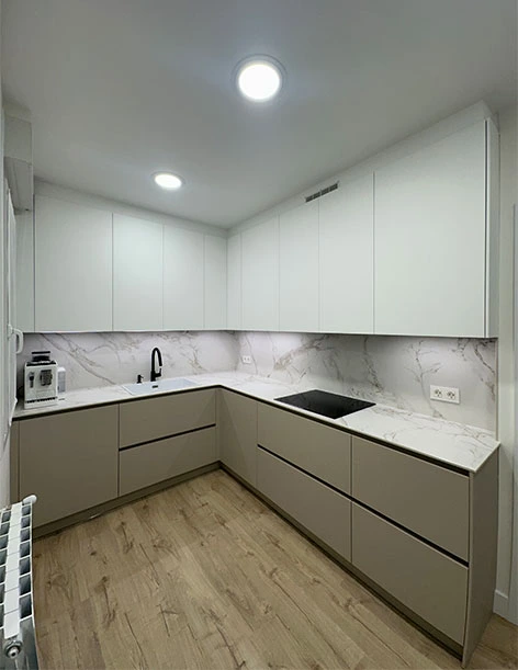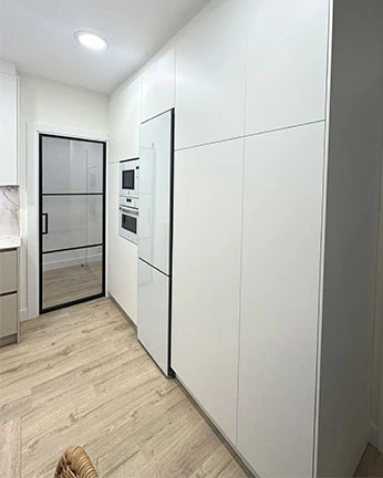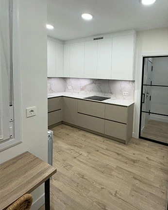 En este proyecto, la protagonista es una cocina en tonos beige y blanco con sistema gola, diseñada para transmitir luminosidad, amplitud y limpieza en cada rincón. La elección del color blanco no solo aporta frescura, sino que también amplifica visualmente el espacio, convirtiéndolo en un lugar abierto, pero acogedor a la vez.